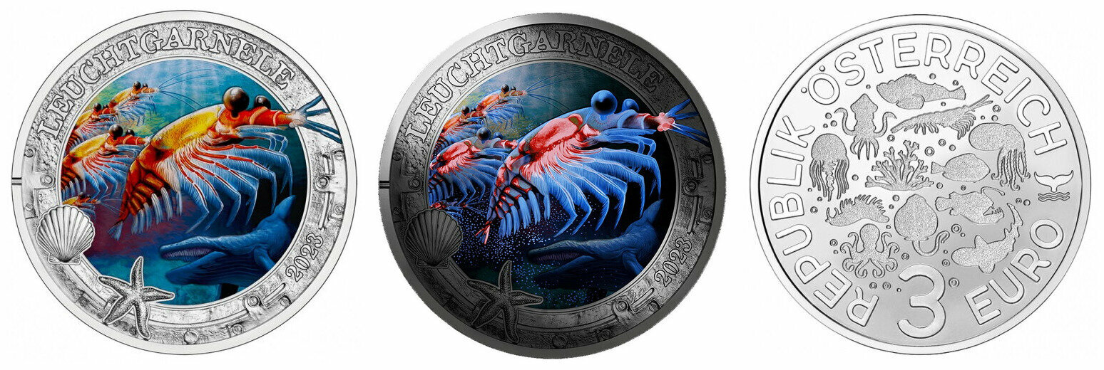 Австрия 3 евро, 2023 Светящаяся морская жизнь - АНТАРКТИЧЕСКИЙ КРИЛЬ креветка