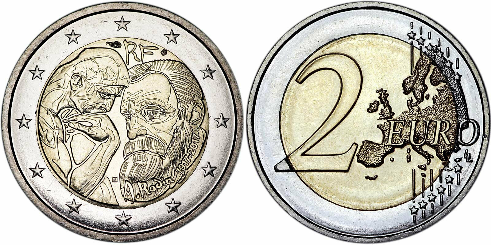 Франция 2 евро, 2017 100 лет со дня смерти Огюста Родена UNC