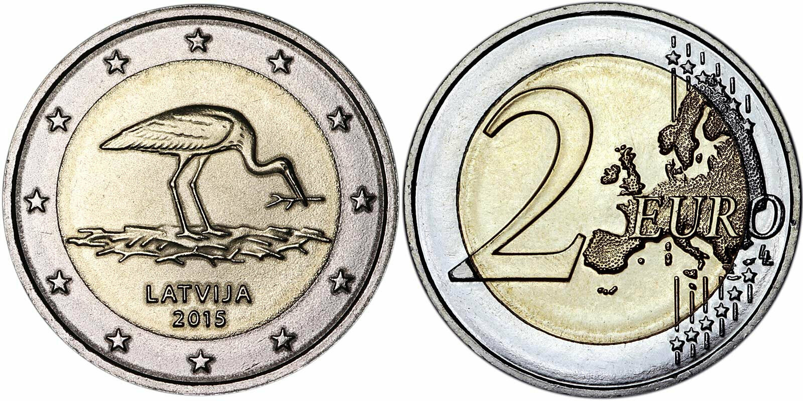 Латвия 2 евро, 2015 Вымирающие виды - Чёрный аист UNC