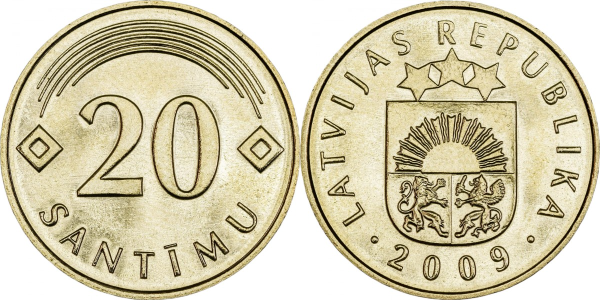 Латвия 20 сантимов, 1992 - 2009 Герб XF