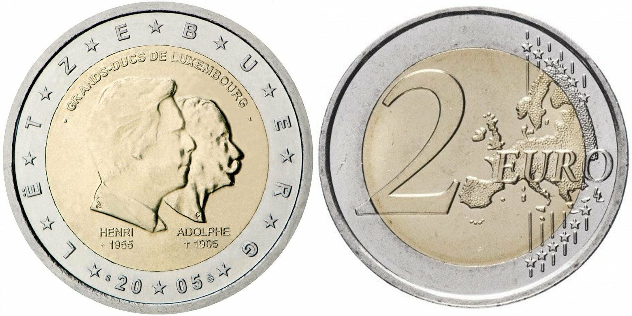 Люксембург 2 евро, 2005 50 лет правящему монарху Анри Нассау и 100 лет со дня смерти герцога Адольфа XF