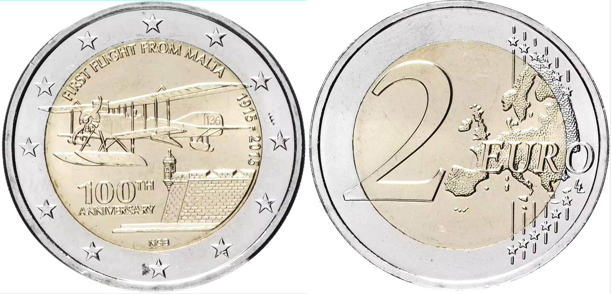 Мальта 2 евро 2015 100 лет Первому полету из Мальты UNC