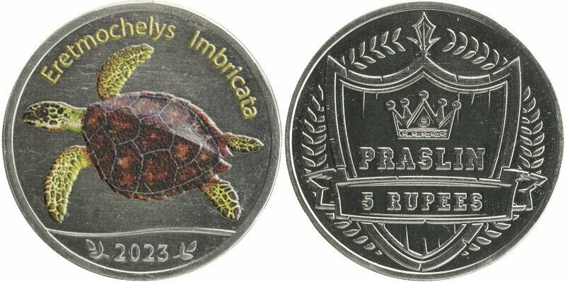 Остров Праслин 5 рупий 2023 Черепаха Бисса. Цветная
