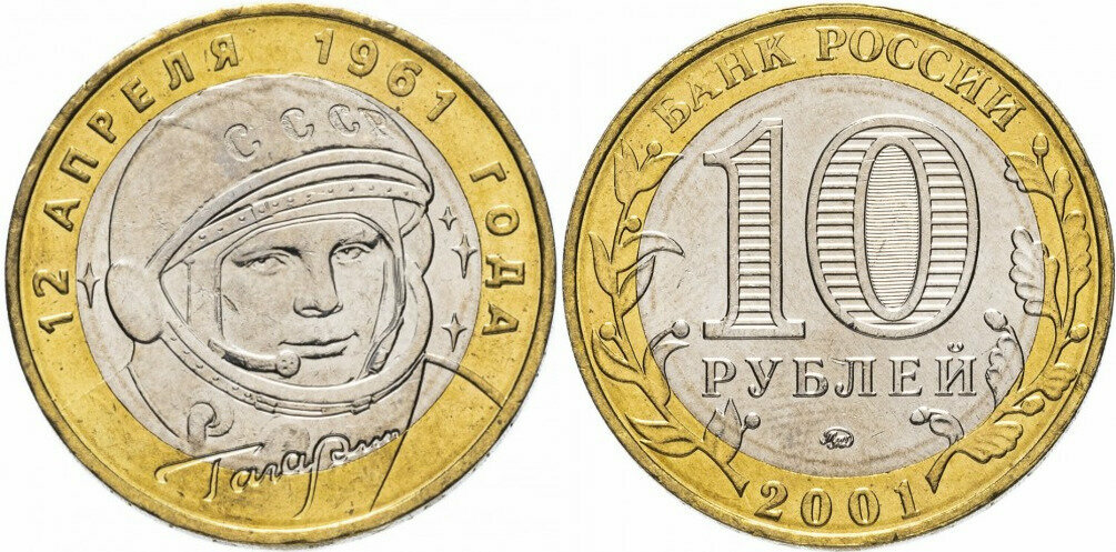 Россия 10 рублей, 2001 40 лет космическому полету Ю.А. Гагарина ММД XF