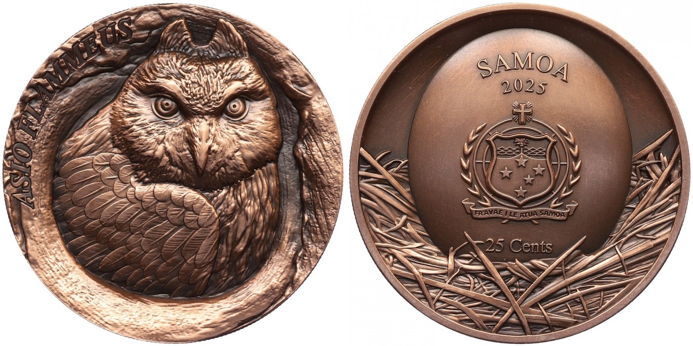 Редкая монета Самоа 25 центов 2025 года с изображением дупла дерева и короткоухой совы – идеальный выбор для вашего нумизматического собрания! Эксклюзивный дизайн монеты подчеркнёт ваш уникальный вкус и станет украшением коллекции. Присоединяйтесь к миру ценителей редких монет, выберите надёжное вложение средств и источник эстетической радости уже сегодня!