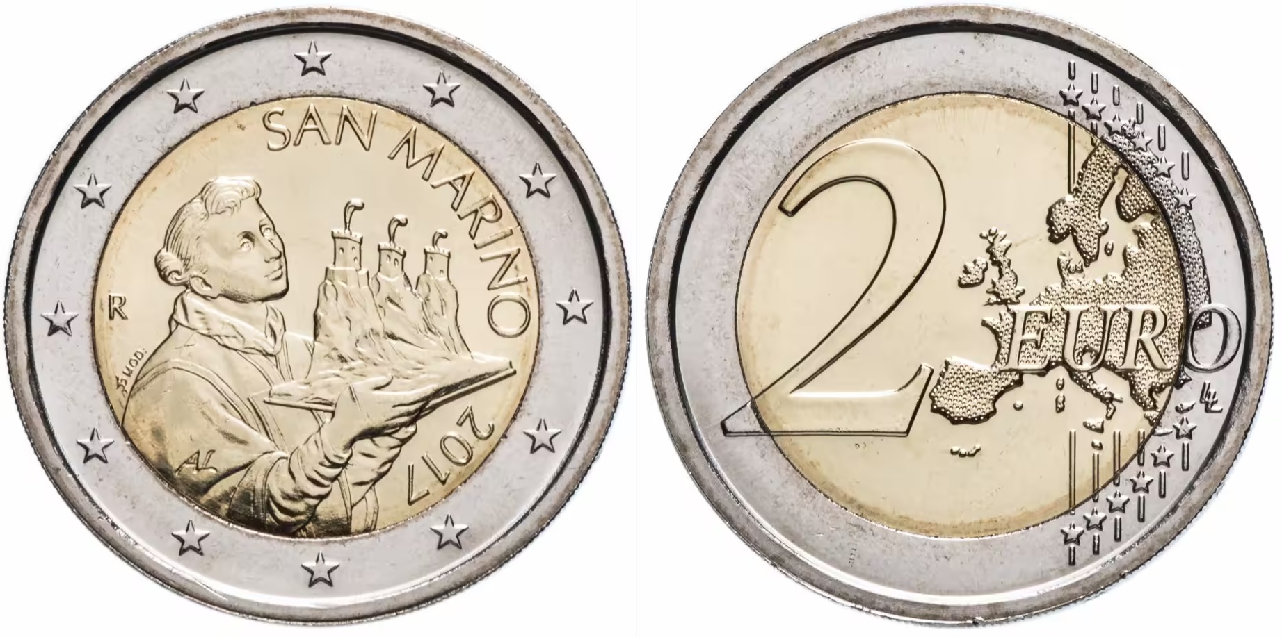 Редкая коллекционная монета Сан-Марино номиналом 2 евро (Святой Марин) периода чеканки 2017-2025 гг., сохранность UNC! Идеальный подарок ценителю нумизматики и уникальной истории Европы! Отличное состояние без износа – идеальна для коллекции. Официальная эмитированная монета европейского государства. Красивый дизайн со святым покровителем страны