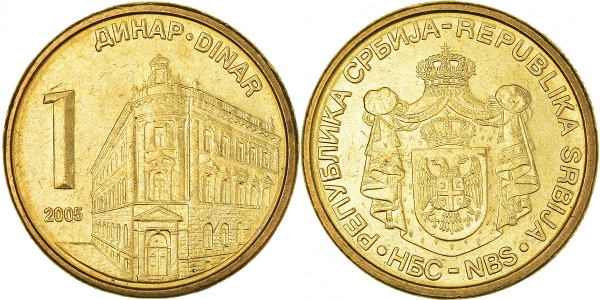Сербия 1 динар, 2005 - 2009 Здание Национального банка XF