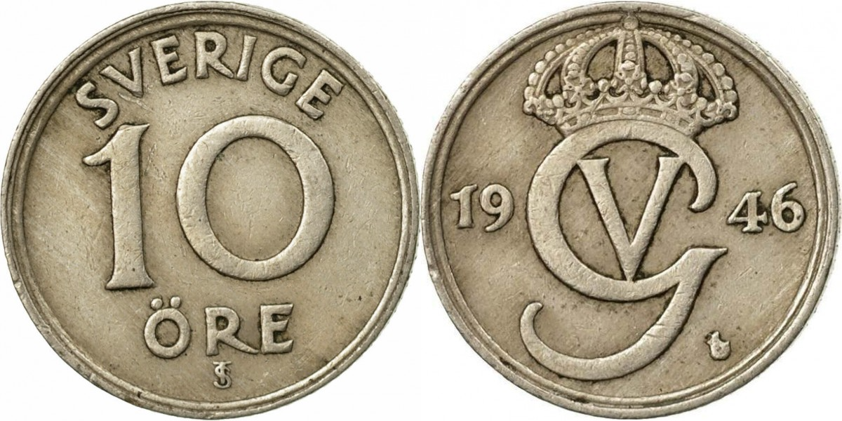 Швеция 10 эре, 1920-1947 Король Густав V VF