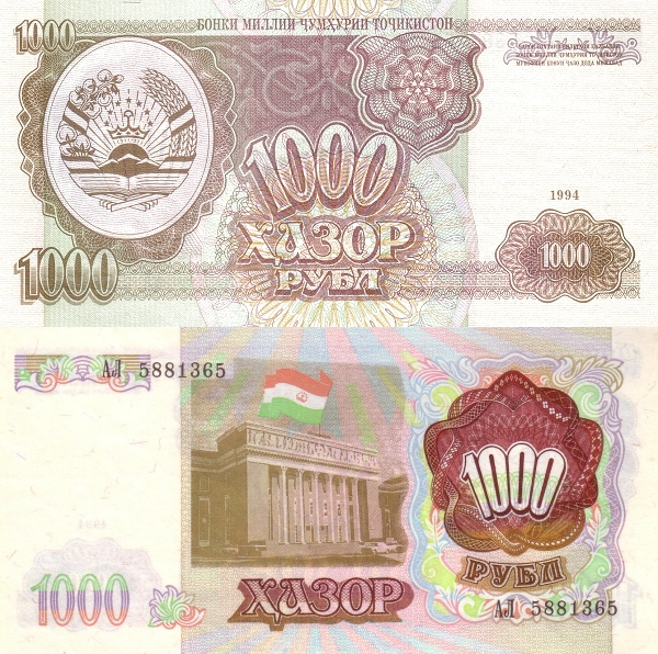 Таджикистан 1000 рублей 1994 Здание парламента UNC
