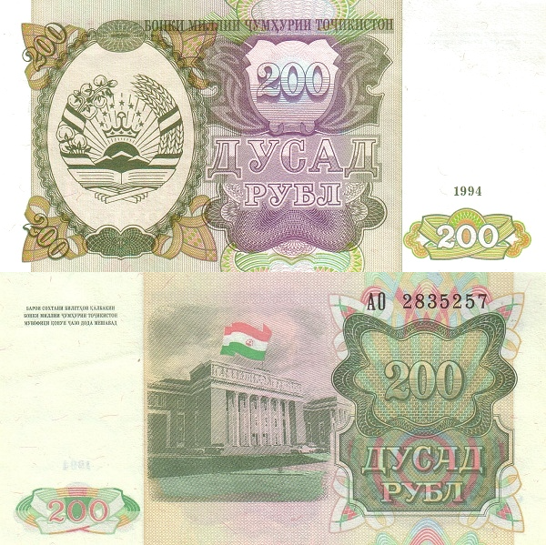 Таджикистан 200 рублей 1994 Здание парламента UNC