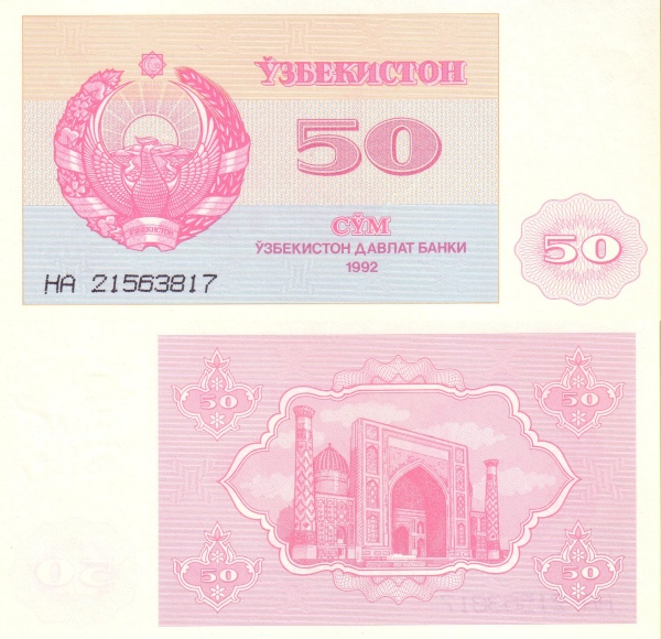 Узбекистан 50 сум 1992 Медресе на площади Реджистан UNC