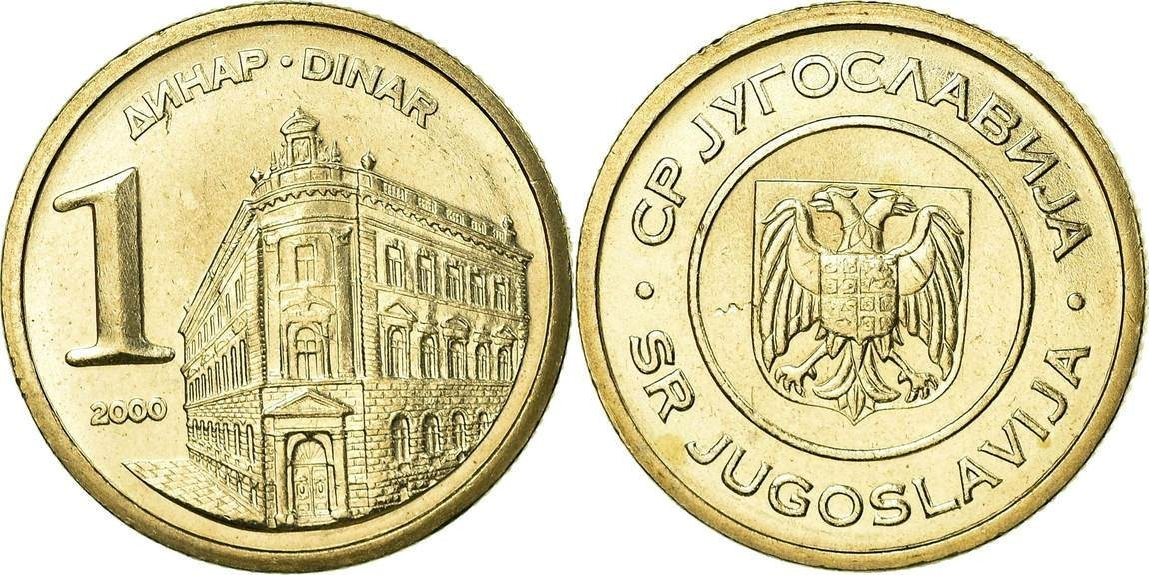 Югославия 1 динар, 2000 - 2002 Здание Национального банка XF